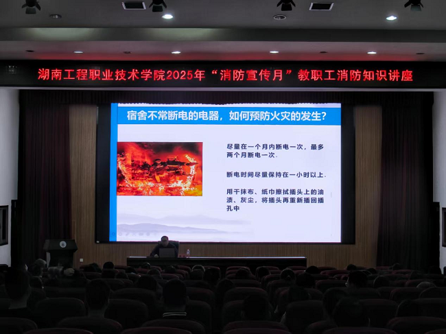 11月12日,学校在求学楼报告厅举办2025年“消防宣传月”教职工消防安全专题讲座。讲座特邀湖南霖钰消防科技有限公司专家陈捷担任主讲,学校全体教职工参加学习。安全保卫部副部长漆平主持。