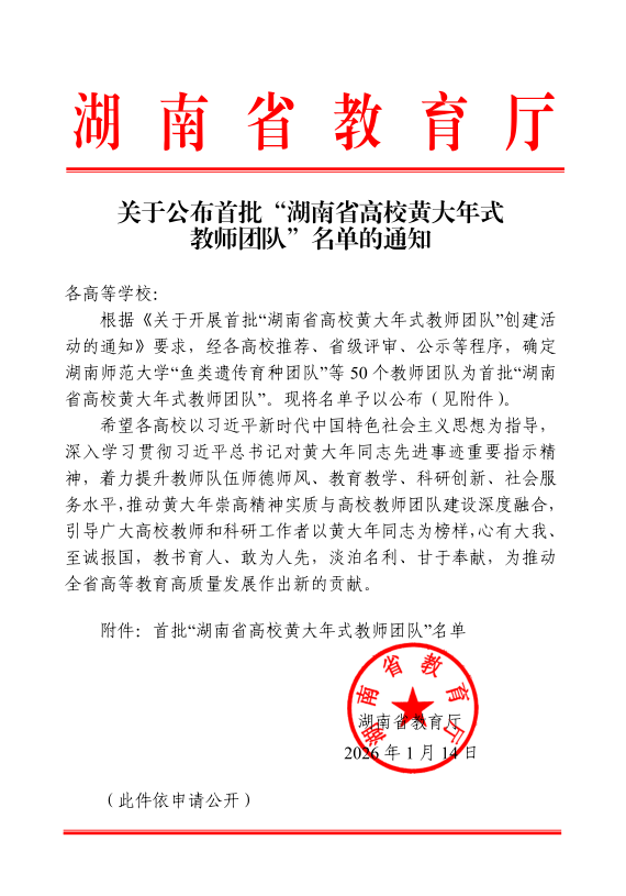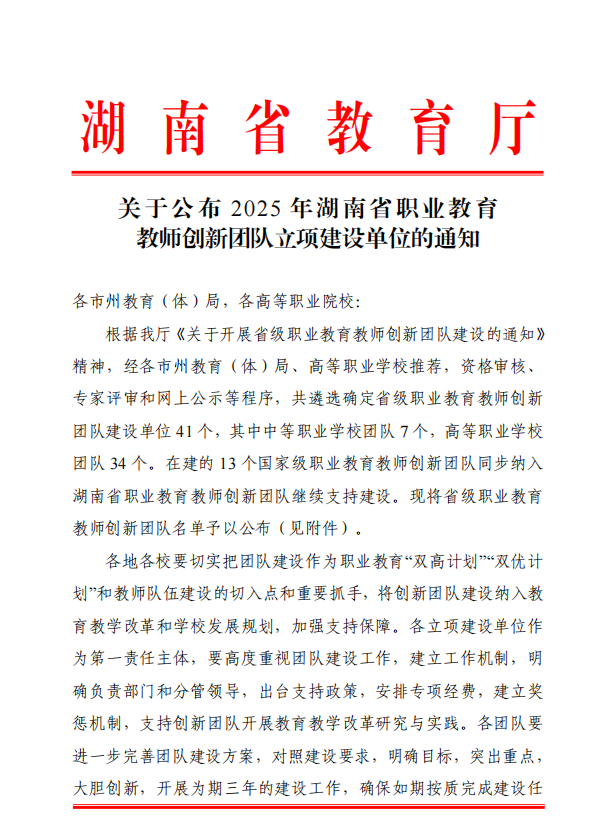 近日,湖南省教育厅发布《关于公布2025年湖南省职业教育教师创新团队立项建设单位的通知》《关于公布首批“湖南省高校黄大年式教师团队”名单的通知》,学校两支教师团队凭借突出专业优势成功入选。