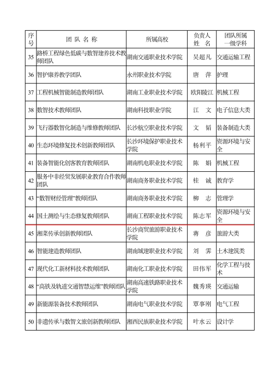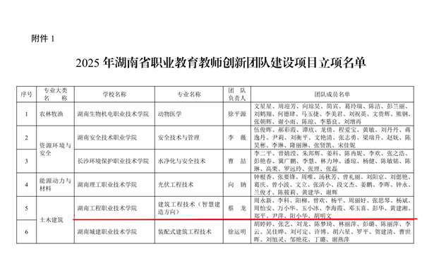 其中,由蔡龙老师负责的建筑工程技术(智慧建造方向)教师团队成功立项2025年湖南省职业教育教师创新团队;由陈志军老师领衔的国土测绘与生态修复教师团队成功立项首批“湖南省高校黄大年式教师团队”,成为全省50个获此荣誉的团队之一。