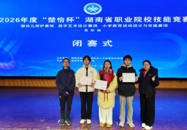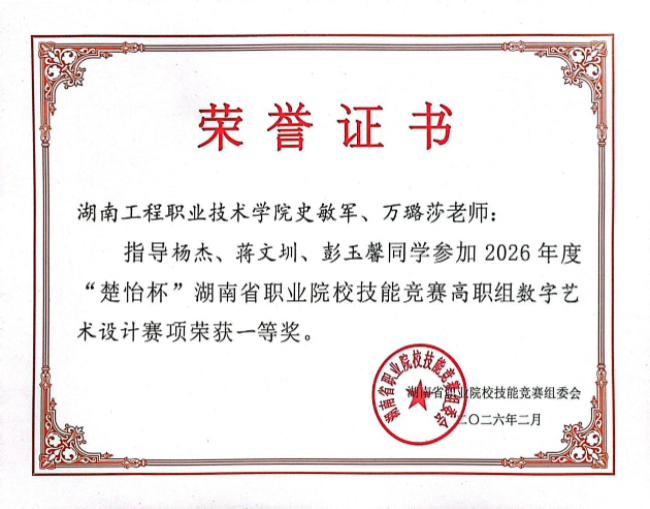 近日,在2026年度“楚怡杯”湖南省职业院校技能竞赛中,学校工程设计学院动漫制作技术专业学生团队凭借过硬的专业技能与出色的现场发挥,在“数字艺术设计”赛项中荣获一等奖。