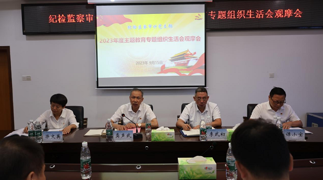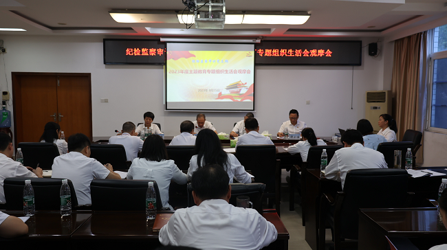 为推动全国高校党建工作样板党支部的榜样带动和示范引领作用,近日,学校组织纪检监察审计党支部举行了样板党支部2023年度主题教育专题组织生活会观摩会,学校党委书记龚声武、党委副书记李武初、党委委员谭小宝、学校各党(总)支部书记等人参加了观摩会的,学校纪委书记柒文英作为普通党员参加组织生活会,纪检监察审计党支部书记主持会议。