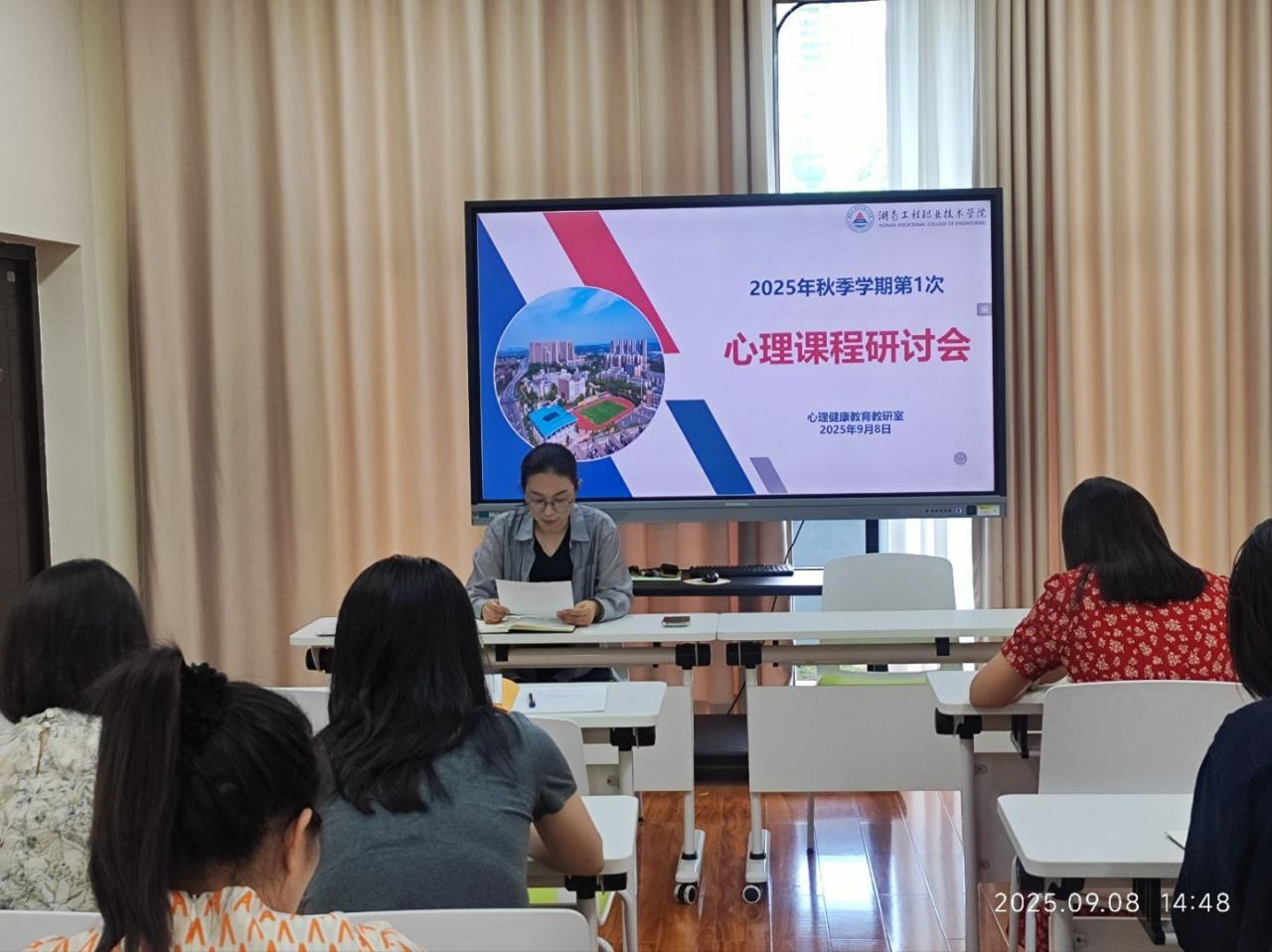 为进一步提升大学生心理健康课程教学质量,明确新学期教学方向,2025年9月8日下午,学校健康教育教研室在求文楼210召开了2025-2026学年第一学期首次教研室会议。学生工作部副部长、健康教研室主任何炎芬主持会议,全体专兼职任课教师齐聚一堂,共话大学生心理健康教育课程建设与发展。