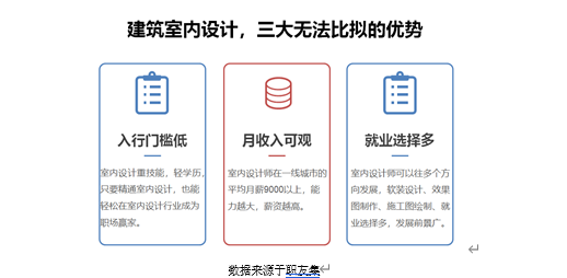 专业前景:中国房地产的崛起,买房热的兴起,家装行业也在近几年不断发展。二、三线城市经济发展迅速、新增建筑带来的建筑室内设计行业需求增长强劲,目前,中国城镇化达60%,相配套的生活、交通、商业等基础设施和空间的建设需求广阔,将为建筑室内设计行业市场带来巨大的活力。根据中国产业信息报告显示,未来几十年内,室内设计行业都将处于高速上升的阶段,具有很大的发展潜力!