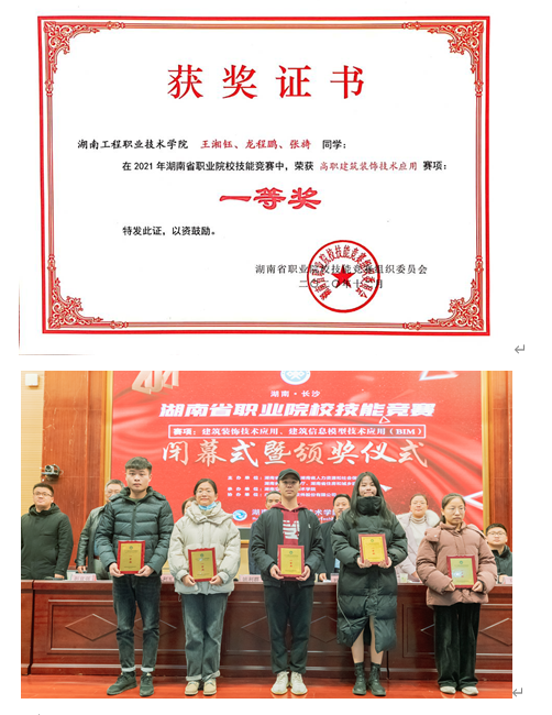 建筑室内设计专业2018级学生王湘钰、龙程鹏、张旖在2021年湖南省职业院校技能竞赛中,荣获高职建筑装饰技术应用赛项一等奖。