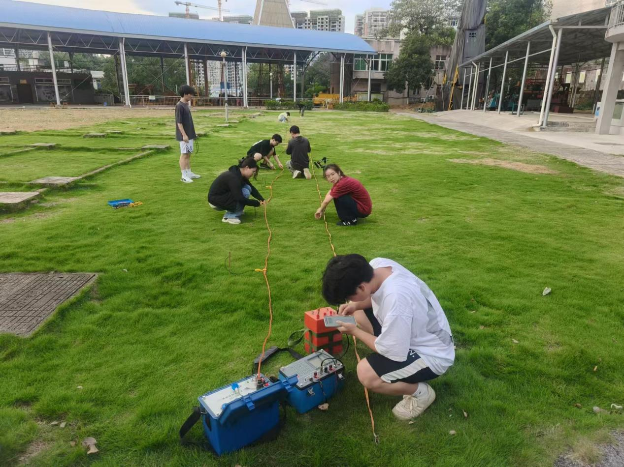 试验场上,项目成员分工有序,布设勘查电缆电极,调试电信号发射与接收装置。据项目指导老师介绍,原来的接收机单次只能接受1种频率电信号,而研发升级后的可以实现同时接收多个不同频率的电信号。此外,每一台接收机都可以接入局域网,在智能手机端集中操作,原先1人单次只能操作1台设备,到如今可同时操作5台以上,极大节约了人力成本。