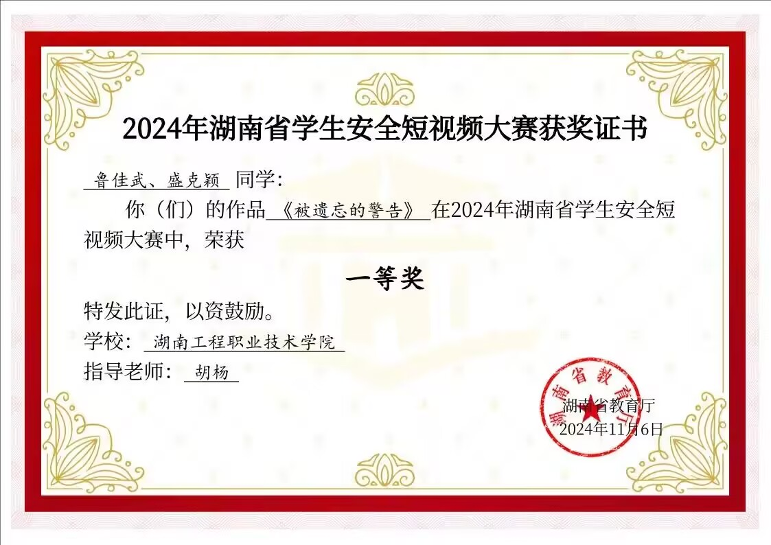 胡杨老师指导鲁佳武、盛克颖获湖南省学生安全短视频大赛一等奖