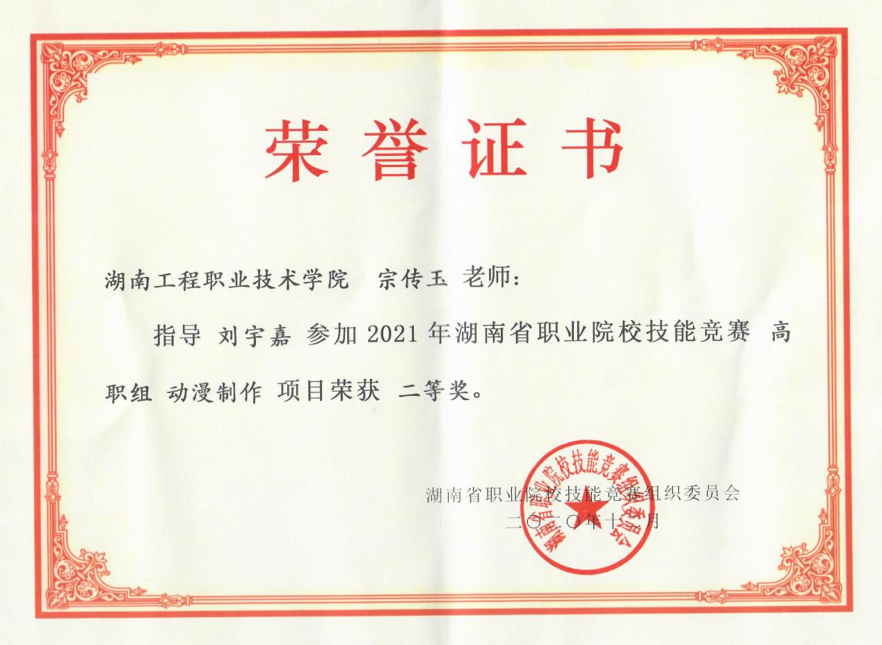 宗传玉老师指导刘宇嘉荣获湖南省职业技能竞赛动漫制作赛项二等奖