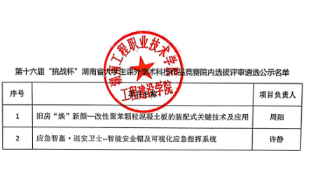 根据共青团湖南省委下发的《第十六届“挑战杯”湖南省大学生课外学术科技作品竞赛预通知》文件精神,工程建设学院组织开展院内遴选工作。经各团队自行申报、学院评审,拟推荐以下2个优秀作品到校团委参评(具体见附件)。现将遴选结果予以公示。