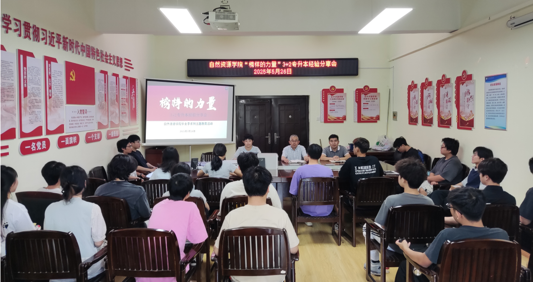 为精准指导备考方向,强化榜样引领作用,5月26日12点半,自然资源学院在求文楼310会议举办"榜样的力量"3+2专升本经验分享会。学院院长唐保华、党总支书记李勇、学工办主任刘云春出席会议,2023级40余名意向升本学生齐聚一堂,共同聆听优秀学子经验分享。