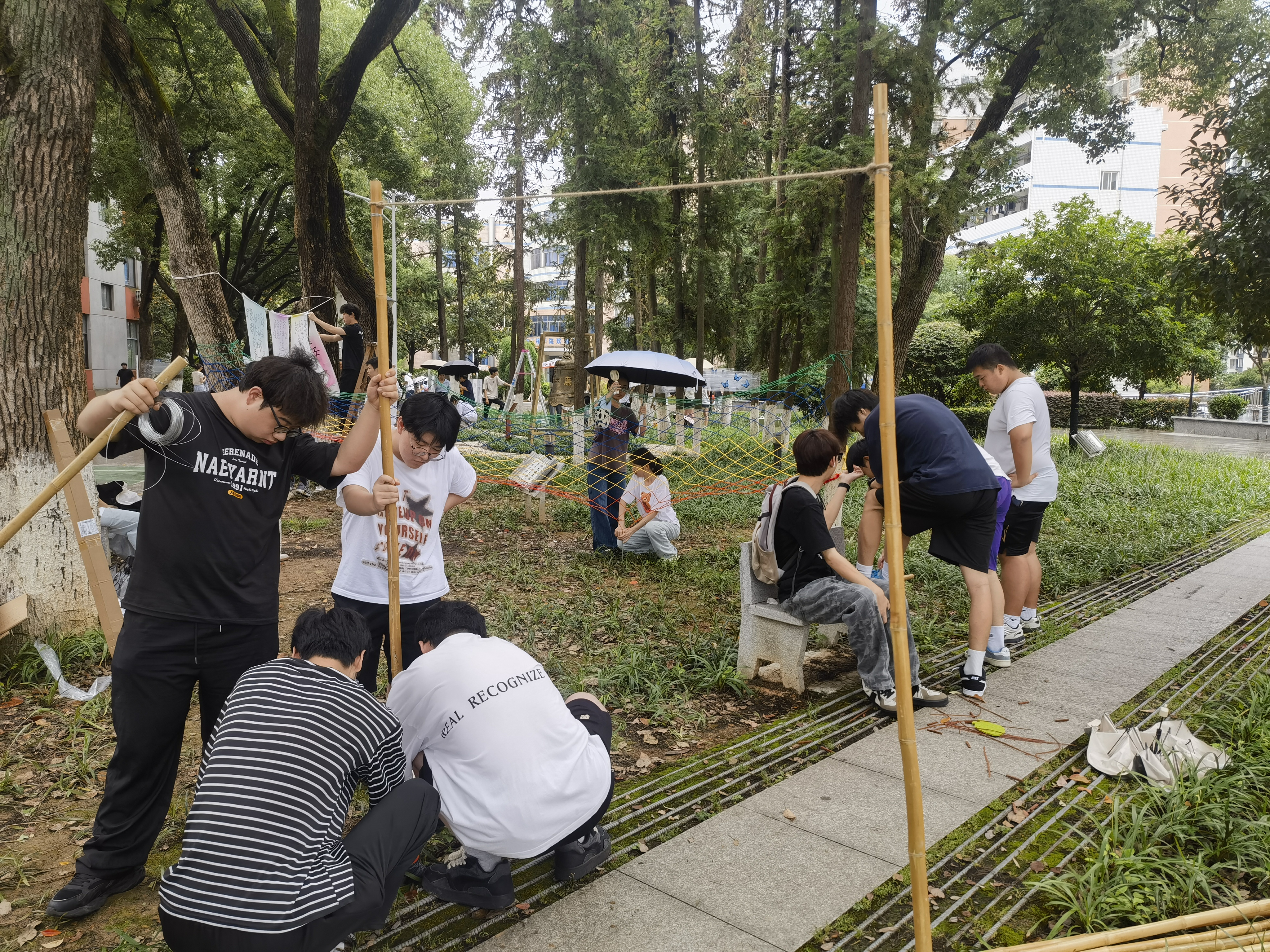 在课程前期准备阶段,师生团队深入研习环境心理学中“空间-行为-情感”的作用机制,重点探讨如何通过色彩心理学、材质感知、空间布局等专业手段,激发大学生对校园空间的情感认同。“我们希望通过设计唤醒学生内心的童真,同时传递积极向上的青春力量。”课程负责人卢宇婷老师介绍道。在设计构思中,学生们将课程思政要求转化为具体设计语言:选用塑料、木棍、麻绳等可回收材料,既践行绿色环保理念,又通过低成本材料的创意转化体现“变废为宝”的创新思维;团队协作完成从方案设计到现场施工的全流程,深度培养沟通协调与责任担当意识。