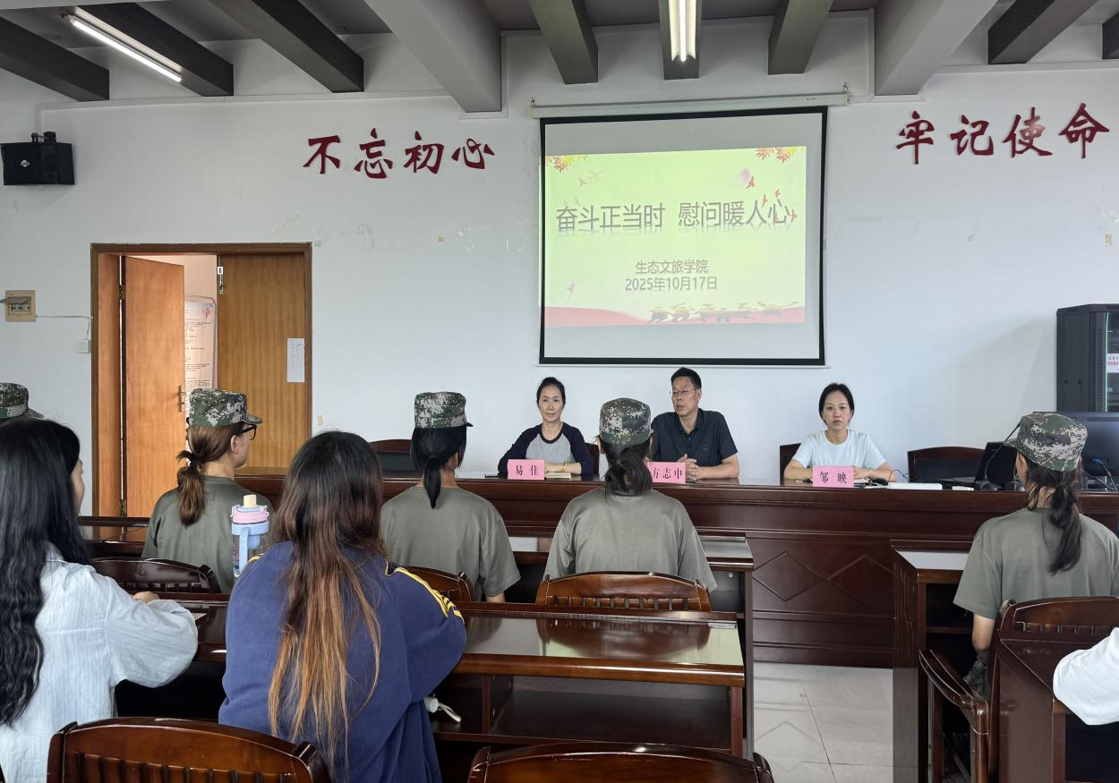 为表达对军训教官和助理辅导员辛勤付出的诚挚感谢,深入践行“五育并举”的育人理念,2025年10月17日,生态文旅学院于求贤楼601开展了慰问2025级军训教官和助理辅导员的活动,学院党总支书记方志中、党总支副书记易佳、学工办主任邹映参与慰问活动。