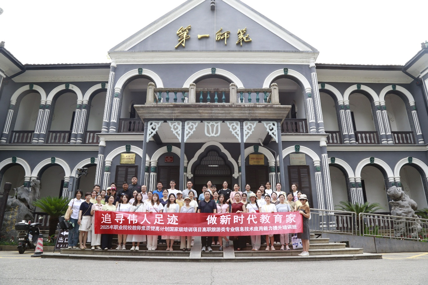 为使学员坚定“为党育人、为国育才”教育初心,赓续红色基因。7月20日上午,2025年高职旅游类信息化应用能力提升国培班以“传承红色基因 为AI时代育人赋魂”为主题,组织学员前往湖南第一师范旧址、徐特立公园开展了“追寻伟人足迹 做新时代教育家”“传承徐特立精神 做新时代教育家”两场沉浸式现场红色教育,来自36所高职院校的50名学员参加了本次活动。