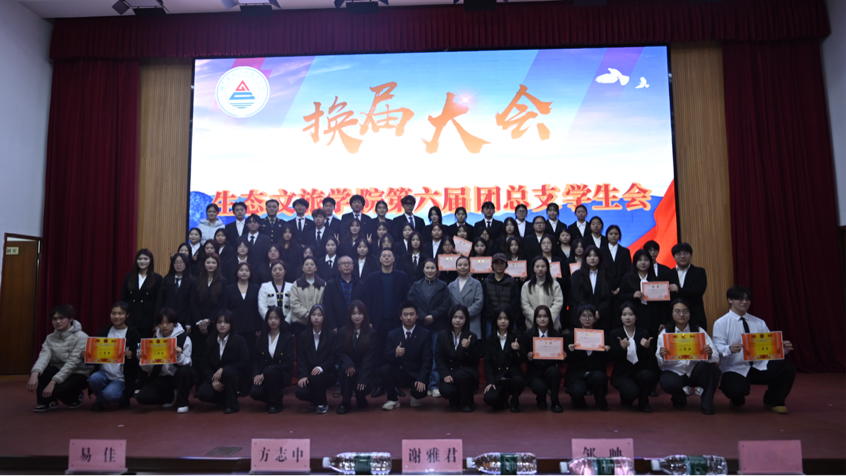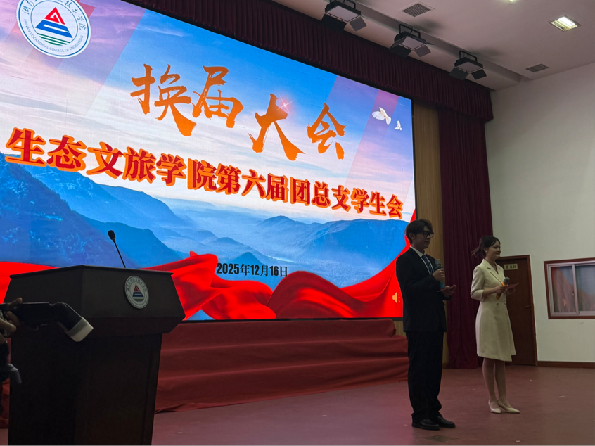 2025年12月16日晚6:30,生态文旅学院第六届团总支学生会换届大会在图书馆报告厅隆重举行。学院党总支书记方志中、党总支副书记易佳、团总支书记谢雅君、学工办主任邹映,全体辅导员和专职教师代表出席了此次大会。出席会议的嘉宾还有校级学生组织、兄弟学院学生组织代表,学院第六届团总支学生会全体学生干部、助辅团成员、大二学生代表及全体大一学生参加了此次会议。